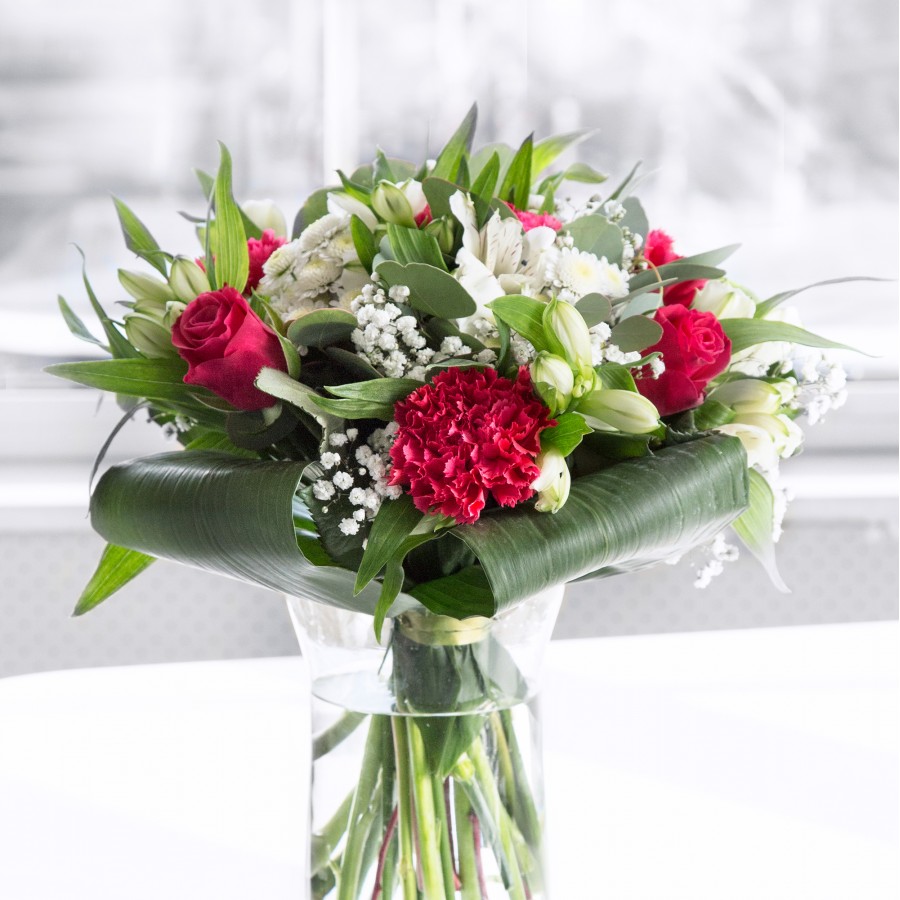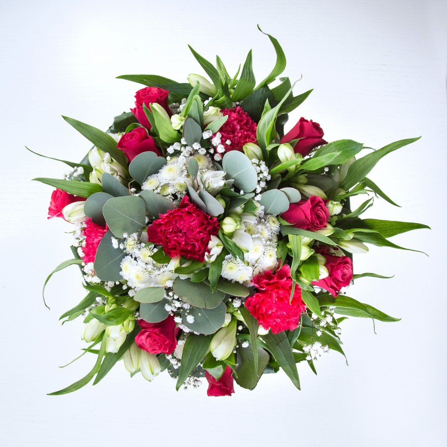 Experience the refined beauty of our Refined Red & White Bouquet. This elegant arrangement features luxurious red roses and carnations intertwined with sweet white chrysanthemums and gypsophila, beautifully complemented by white alstroemeria and aspidistra leaves. Each flower is carefully hand-selected to ensure maximum freshness and lasting vibrancy.